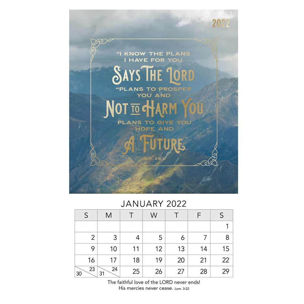 Clouds soak the mountain landscape of this small calendar in misty splendor. The greenery among the mountains affirms God's promise for growth and fruit in your life. The sentiment is written in foiled gold lettering surrounded by a decorative border.