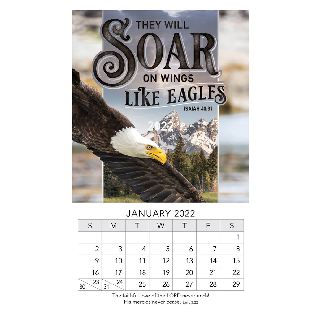 A calming scene of dense forests and snow-capped mountains is set in the center of a blurred background. A magnificent eagle soars into the foreground of the calendar, spreading his intricate wings. The Scripture verse is written in foiled charcoal lettering in front of the clouds.