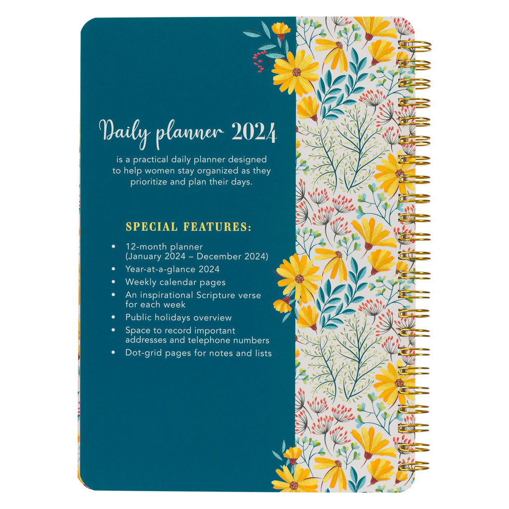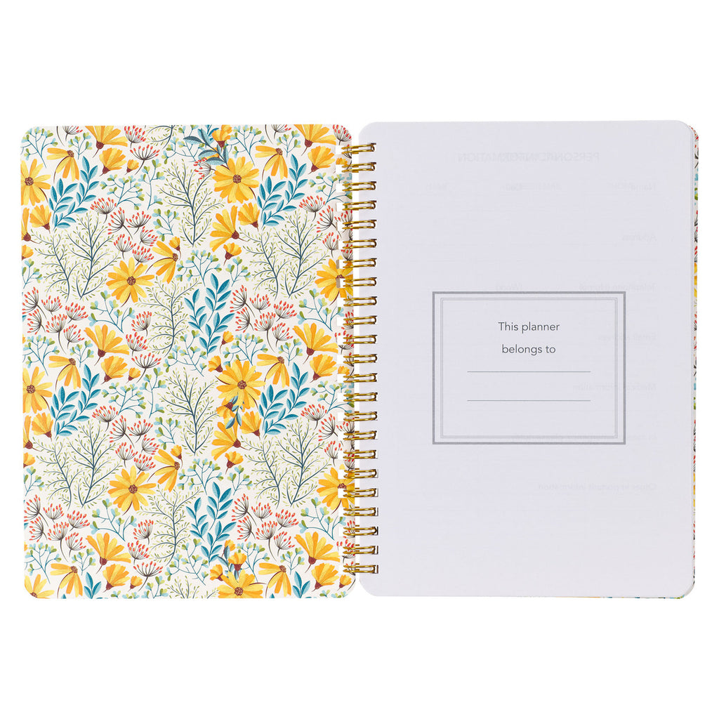 The front cover of the weekly planner features a teal vertical band adjacent to a white band covered in florals and leaves. Bright yellow daisies that pop with color spill over onto the teal section, where the sentiment is displayed in multi-font white lettering.
