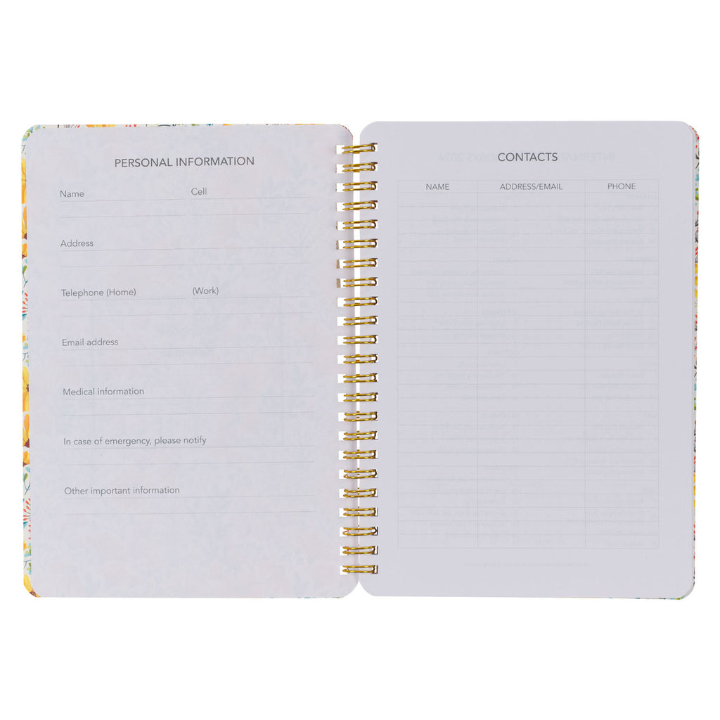 Every weekly planning page features each day of the week with a lined space to record appointments or notes. A weekly Scripture verse is included to inspire and motivate you, and dot-grid pages in the back of the planner provide space for creative note-taking. The back of the planner also has room to record contacts. The bronze-toned wire binding makes this a sturdy planner that can open flat and fold over easily.