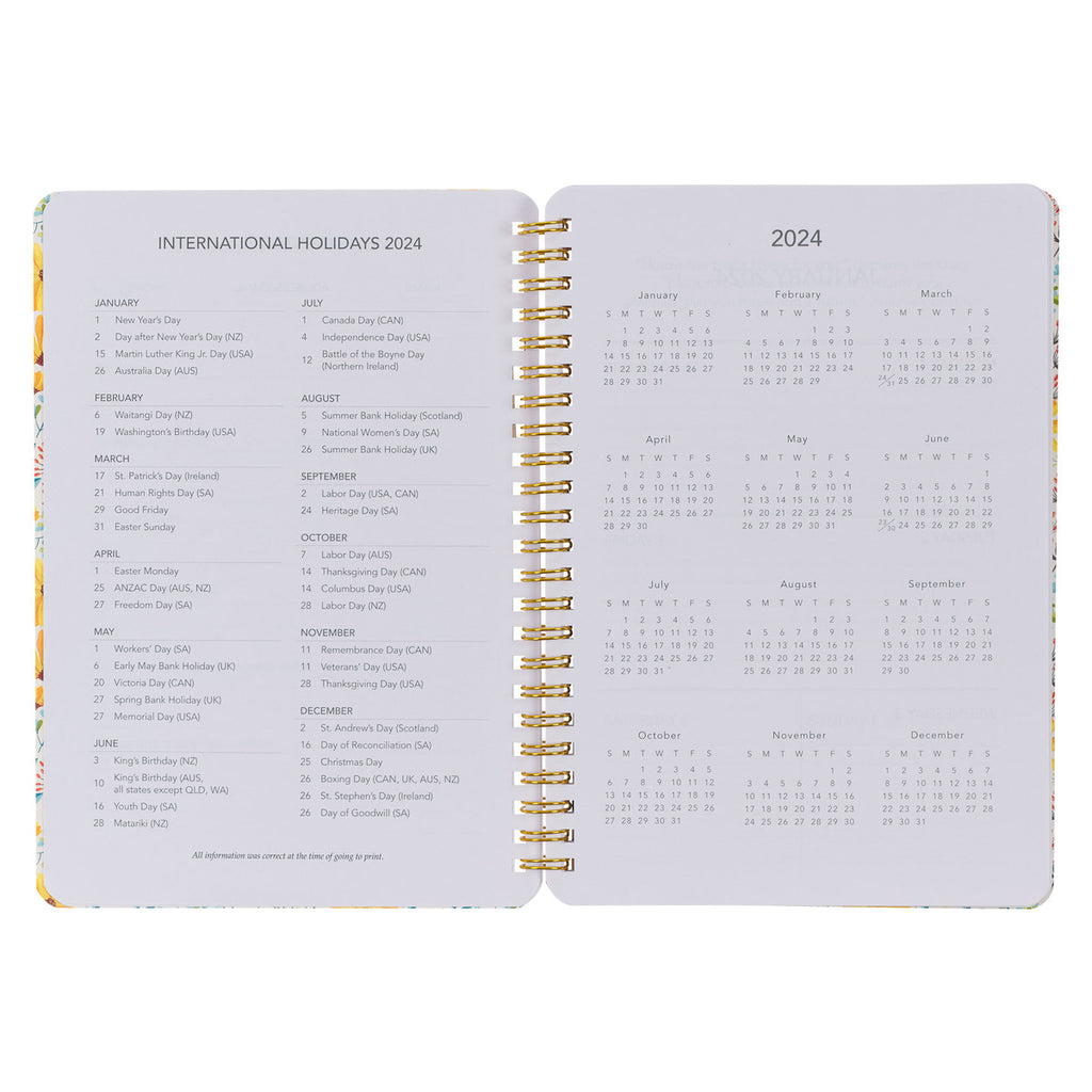 The interior pages feature a full-page year-at-a-glance view of 2024, a list of public holidays, and space to record personal information, followed by weekly planning pages for each week of the year.
