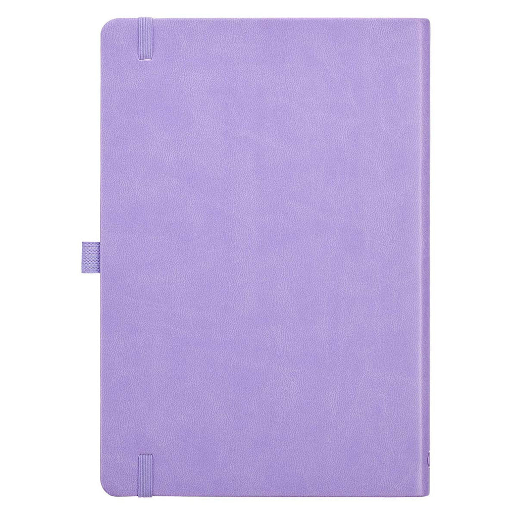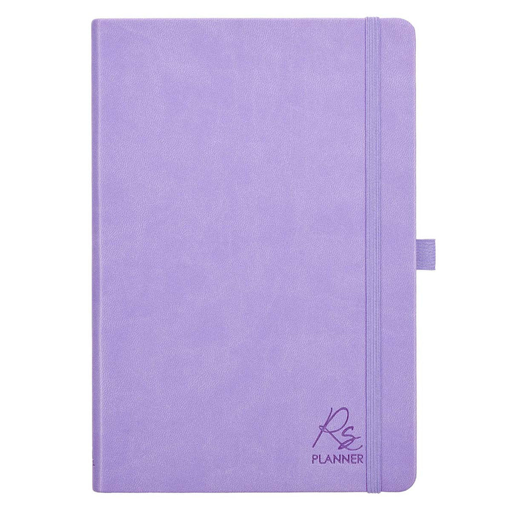 The faux leather cover of the undated planner is a soft shade of lavender—a color carried through the entire planner. The author's signature and the word 'planner' is heat-debossed on the lower right corner of the front cover. A lavender elastic band closure runs vertically along the front cover and an elastic pen loop is attached to the back cover. A lavender ribbon marker is included to save your place.