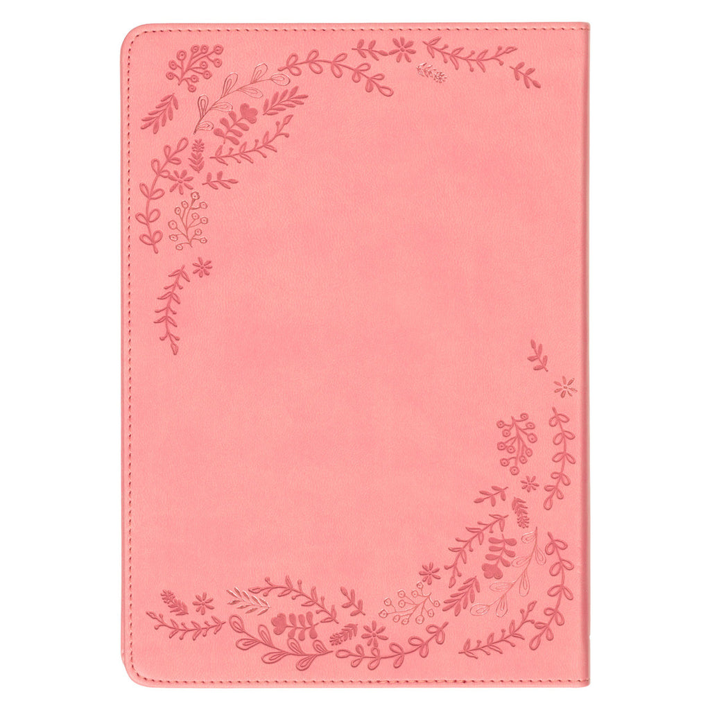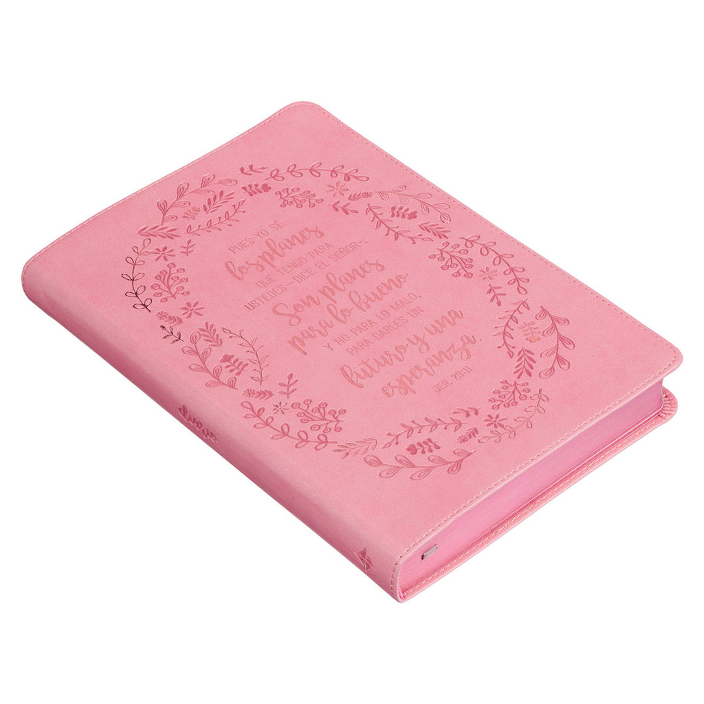 La tapa suave de piel sintética rosa lleva grabada en relieve una corona de hojas florales que rodea el versiculo completo de Jeremias 29:11.
