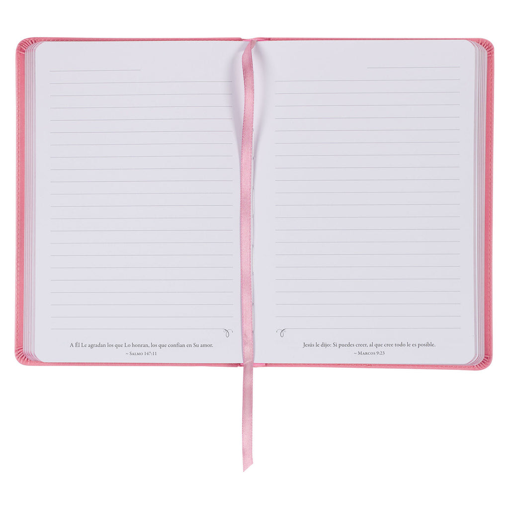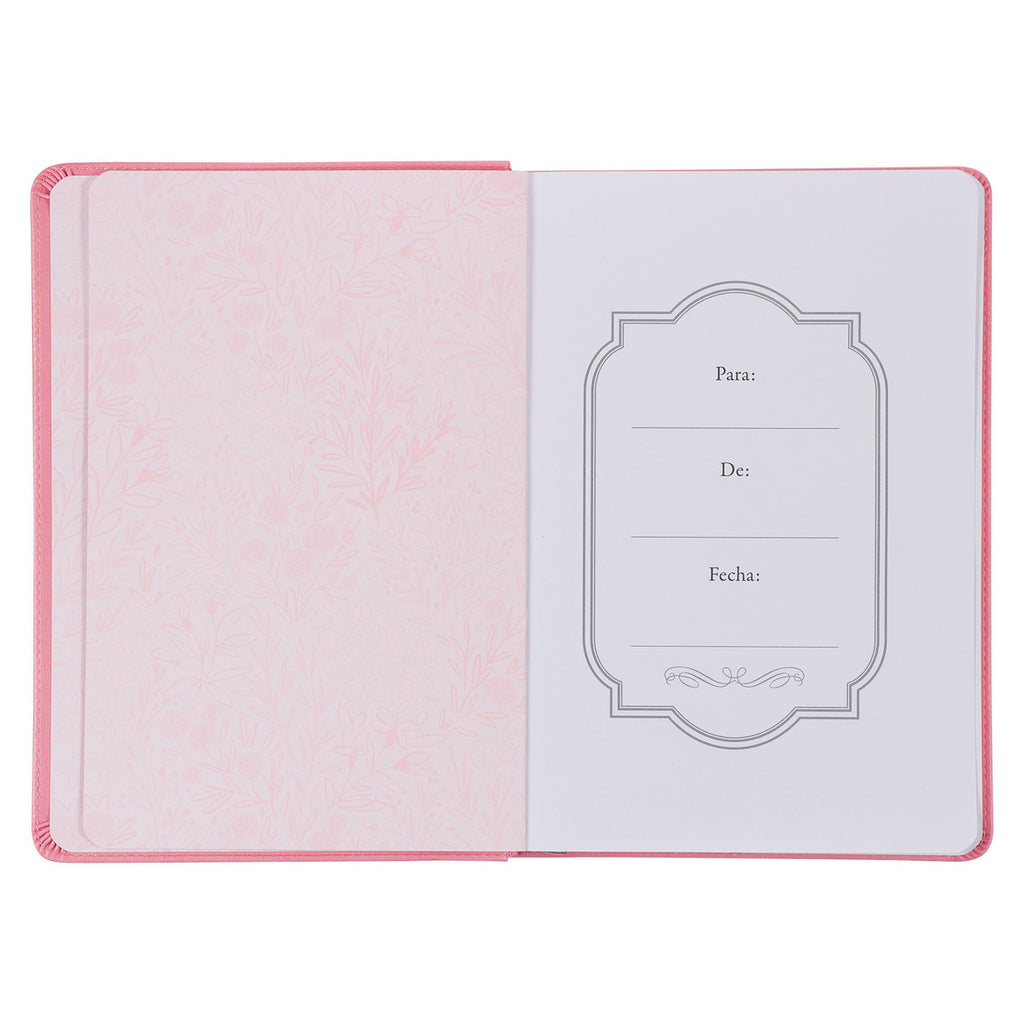 Los detalles de color rosa de la cubierta complementan a la perfecciOn las paginas del diario de color rosa con bordes dorados. En el interior del diario, hay 240 paginas rayadas, un separador de libros de cinta rosa y un versiculo de las Escrituras en cada pagina.