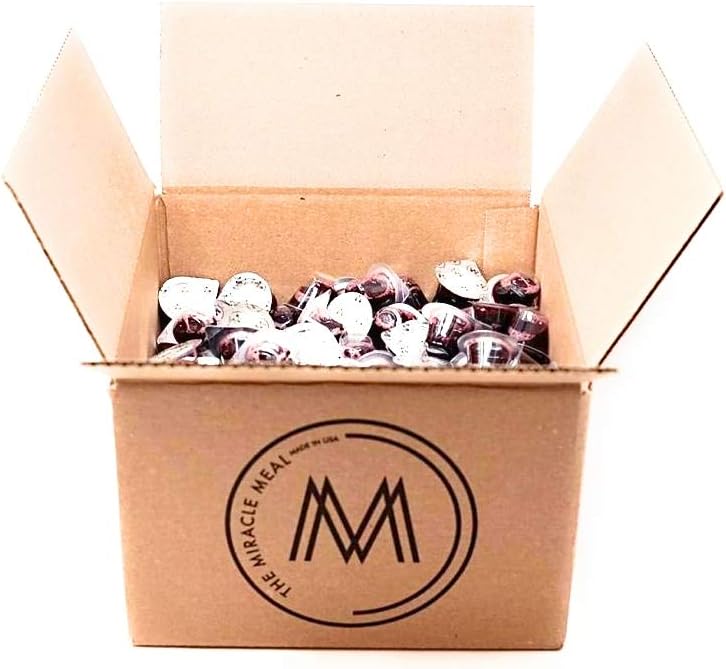 Each serving of The Miracle Meal pre-filled communion cups contains 5 ml of 100% Concord Grape Juice and 1/6 g bread element consisting of a round unleavened wafer made with white wheat flour, water, and salt.