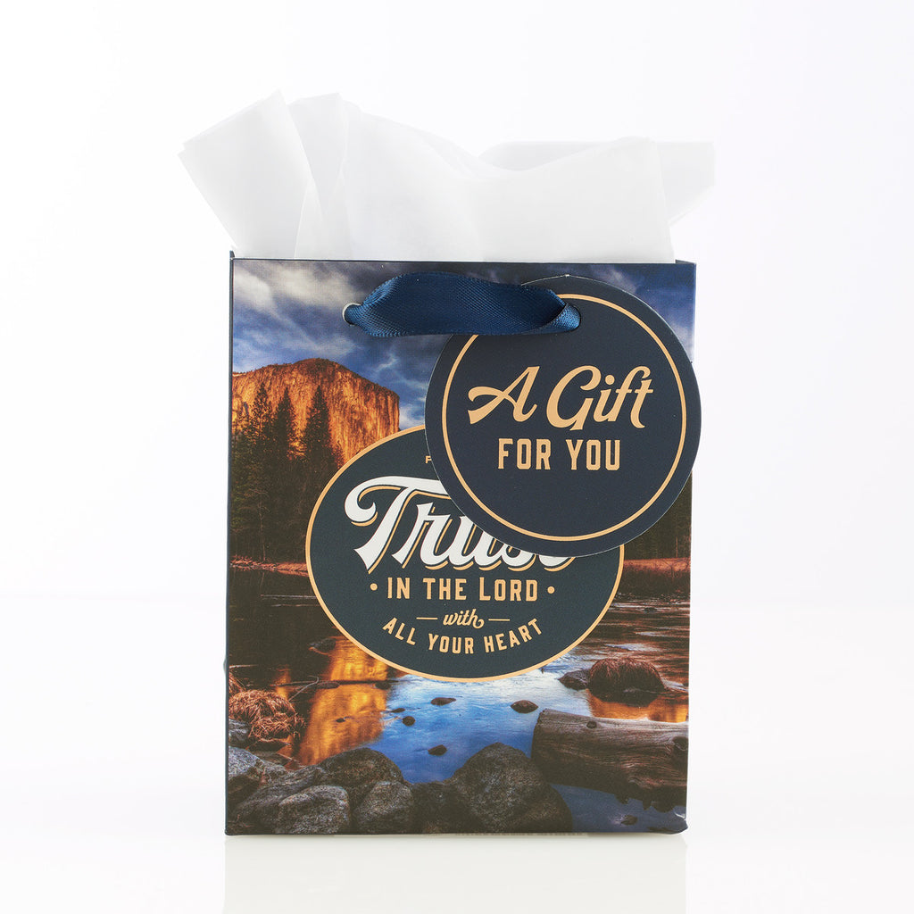 We all need occasional reminders to put our faith in God. This striking mini gift bag is the perfect way to bring these words of encouragement to a loved one: “Trust in the Lord with all your heart” (Proverbs 3:5). The Bible verse - with “Trust” boldly highlighted - is backdropped by a stunning landscape that speaks to the majesty and power of God. While this gift bag is appropriate for anyone, the deep colors make it especially suitable for men.