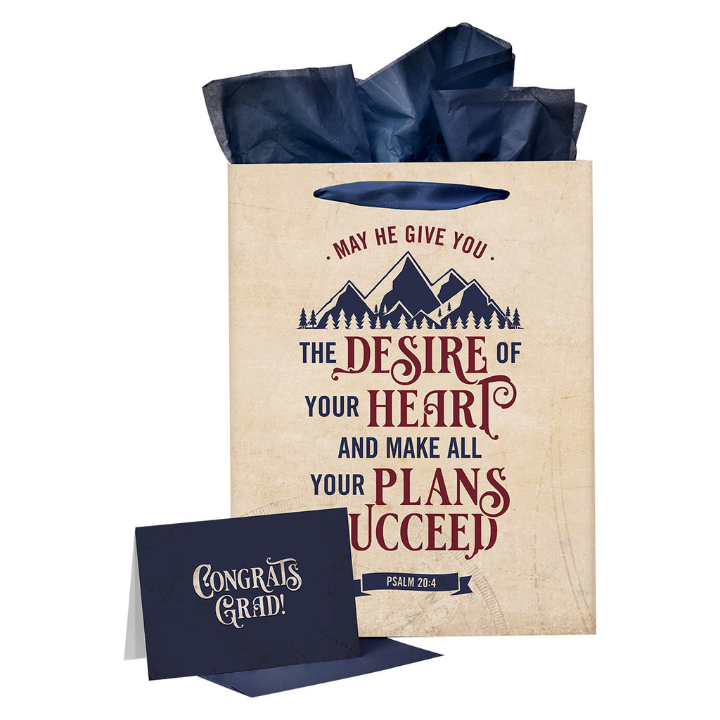Hearten your graduate with the knowledge that God promises to bless the plans and desires that bring them closer to his goodness, no matter their transition or stage in life, when you wrap your next graduation gift in the Desires of Your Heart Large Portrait Gift Bag with Card Set for an eye-catching gift.