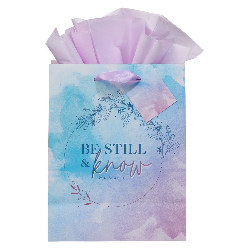 Encourage a friend or loved one with a thoughtful gift placed inside the Be Still & Know Lilac and Blue Watercolor Medium Gift Bag.