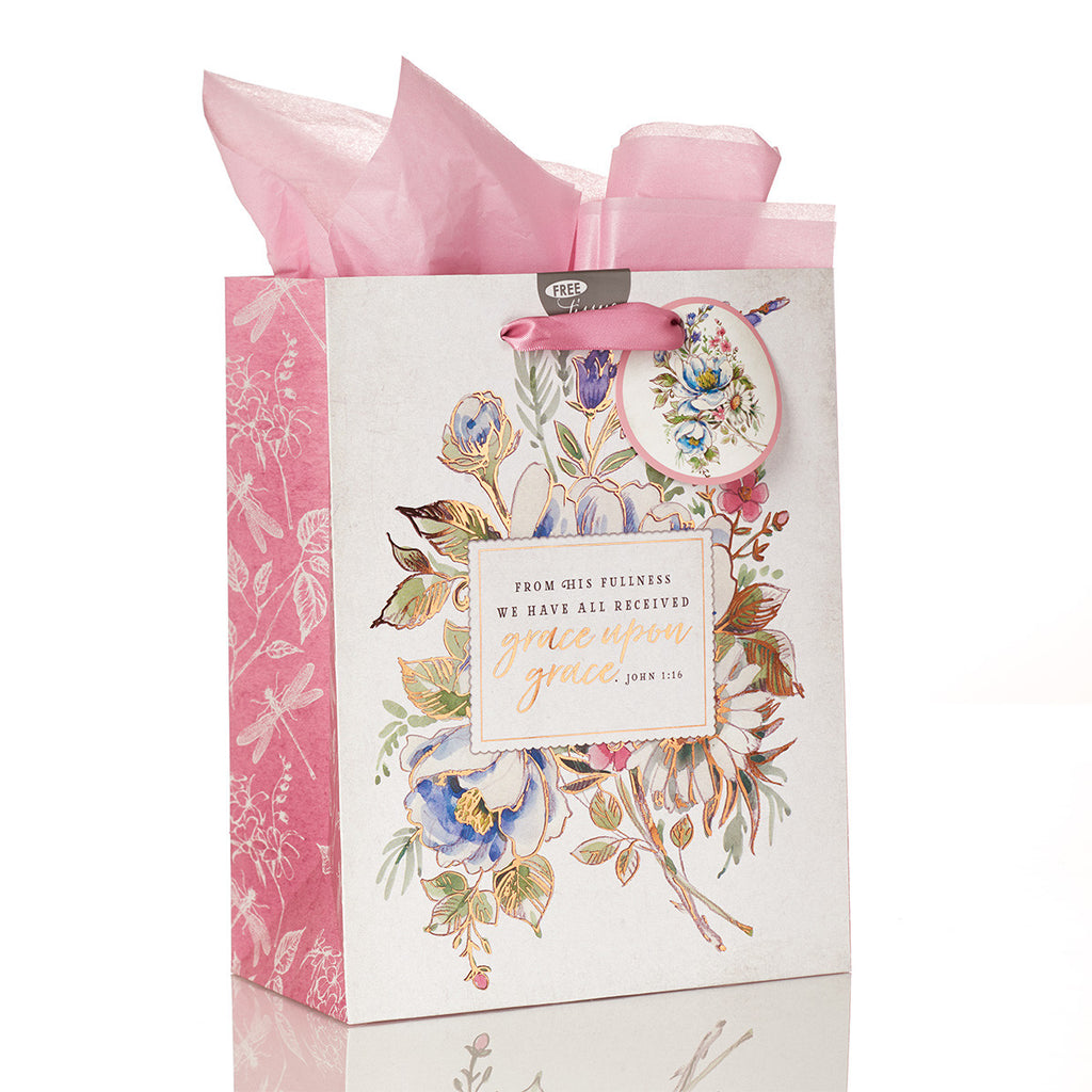 Warmly designed with pastel florals, the Medium Gift Bag: Grace Upon Grace – John 1:16 comes with one sheet of pink tissue paper for wrapping your Christian gift with love, a matching gift tag and two satin pink handles for easy transport of the watercolor gift bag from your home to the home of your loved one.