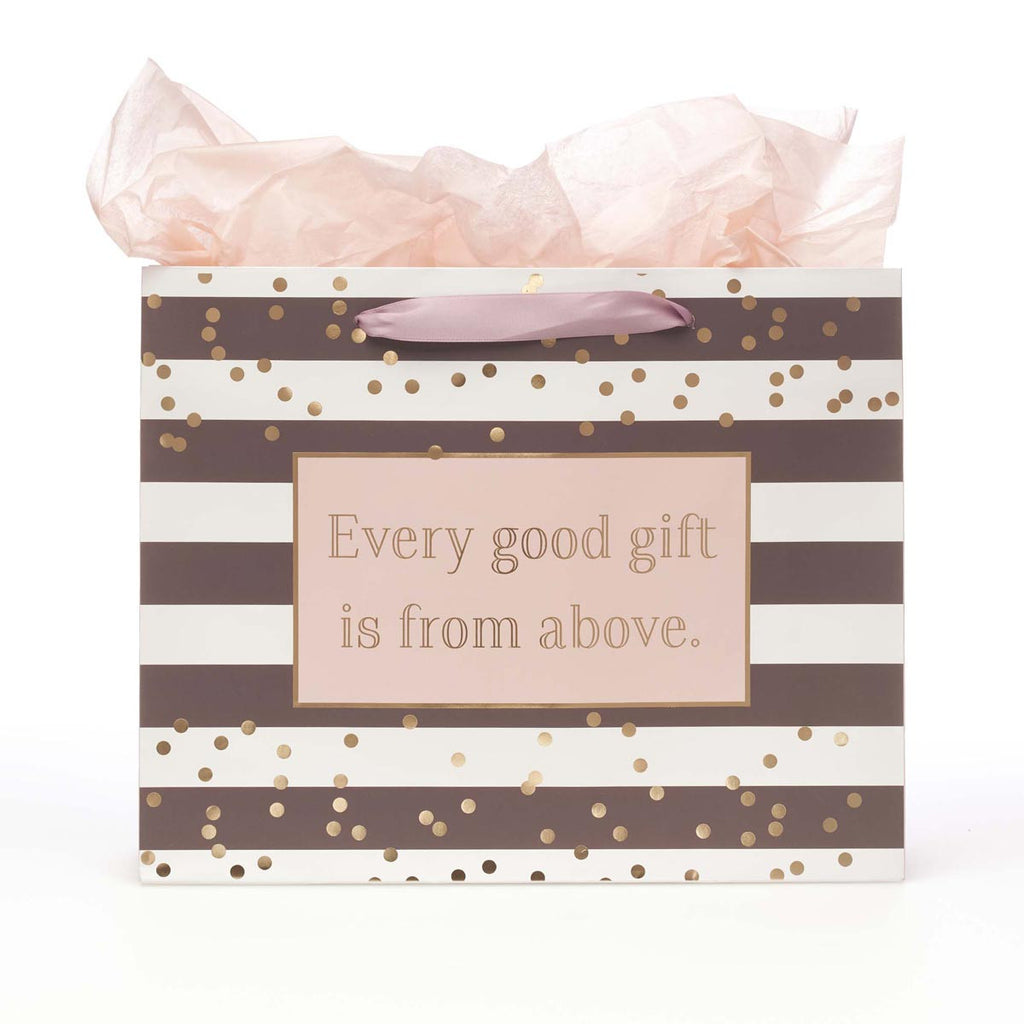 Celebrate Good Things with theEvery Good Gift Large Gift Bag Set. Black and white stripes and gold confetti spread a message of cheer that is highlighted by the gold foiled message, "Every Good Gift Is From Above," taken from James 1:17. A soft blush pink adds a feminine touch to this celebratory gift bag.