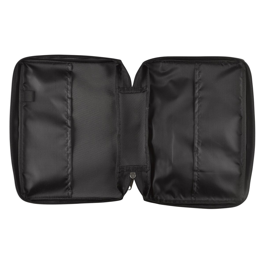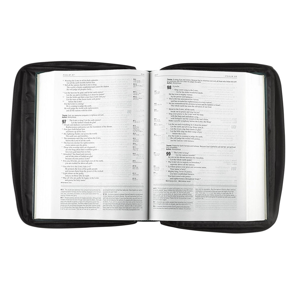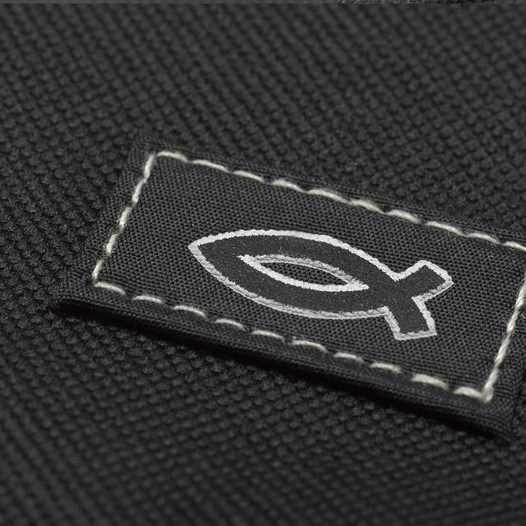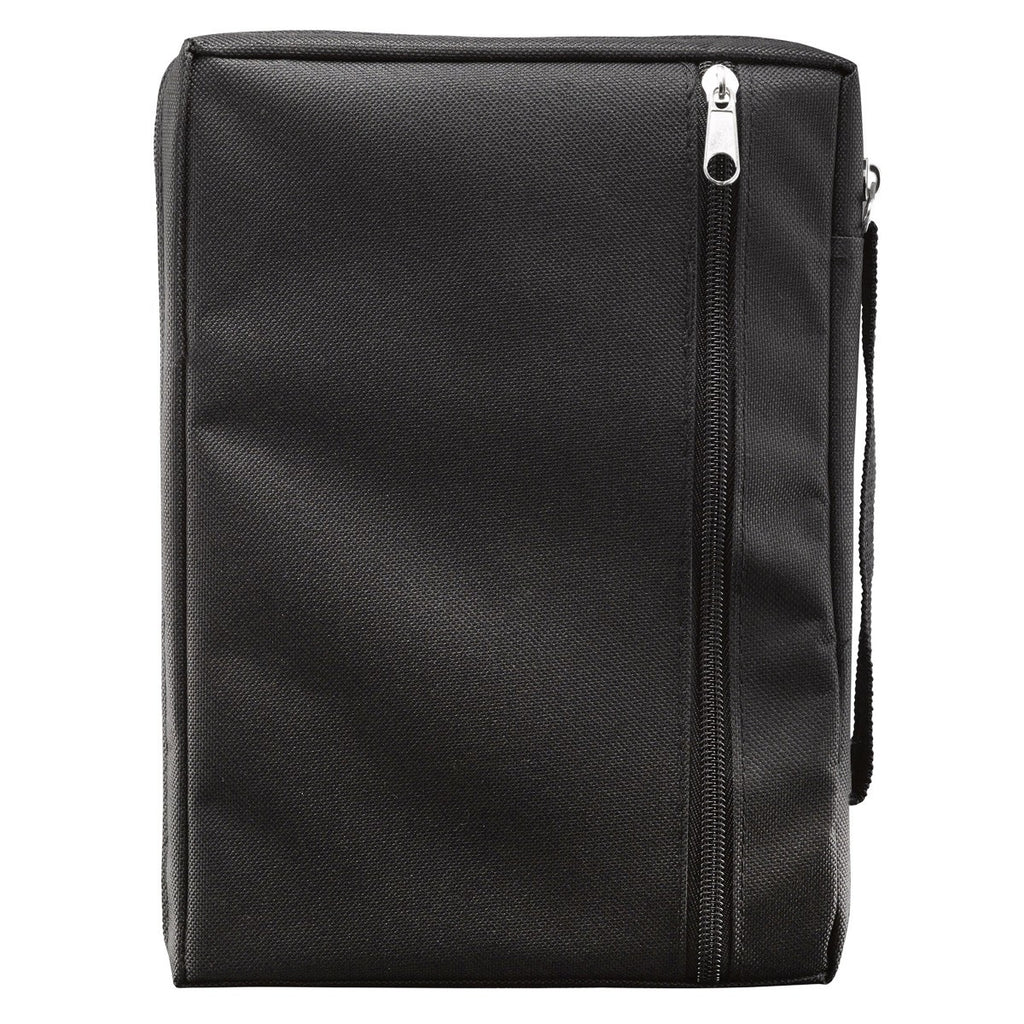 The  heavy-duty poly-canvas Bible Cover features a rubberized fish applique, a webbing carry handle, an exterior zip pocket and a pen loop inside of the case. Great features at an affordable price.