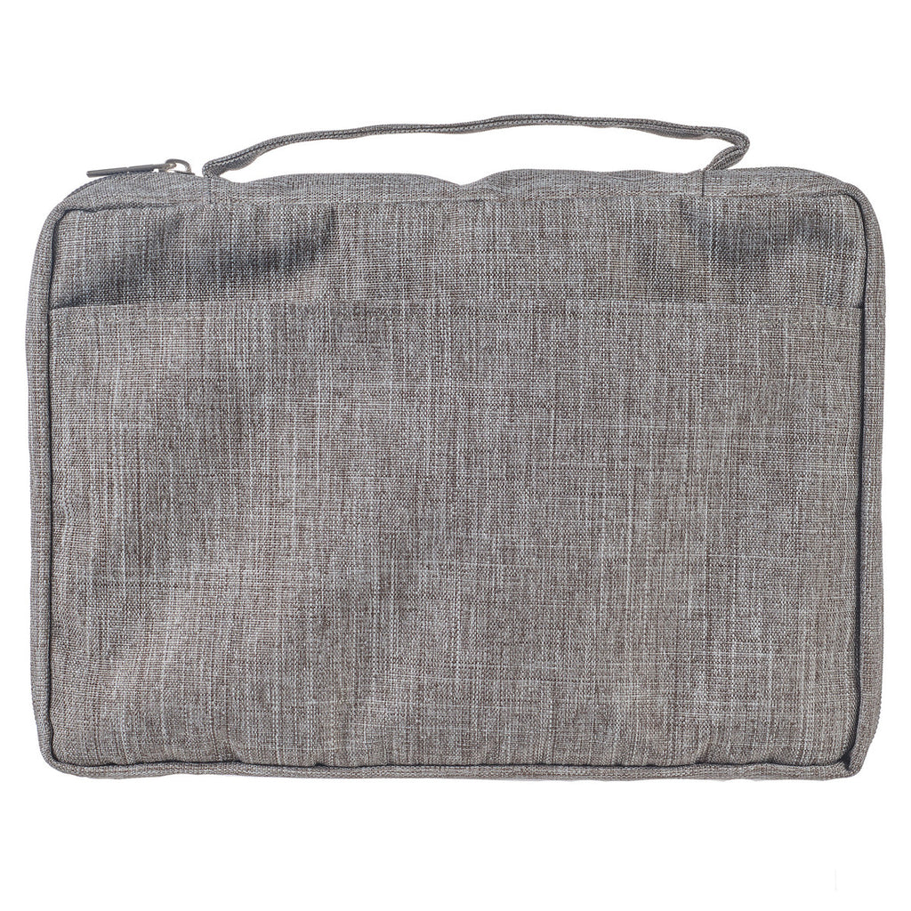 The durable, water-resistant poly-canvas used in constructing the gray Bible case can endure a lot of handling. The front cover is screen printed in black with Scripture taken from the Psalms.