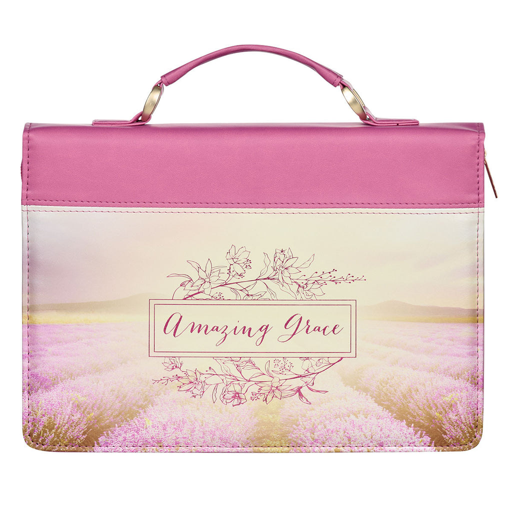 The Amazing Grace Flower Field Pink Faux Leather Fashion Bible Cover will fill your heart with joy as you marvel at God's grace whenever you pick up this protective case to read your Bible.