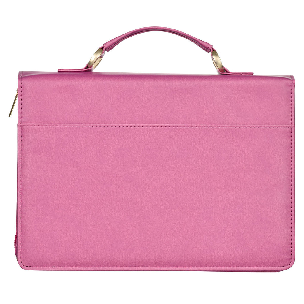 The pink faux leather back cover of this Bible case wraps around the spine to meet the beautiful screen-printed front panel. Here, a tranquil sunlit flower field with a mountain range dimly visible in the background forms the background to the framed sentiment presented in shining pink foil, with an accenting floral line design.