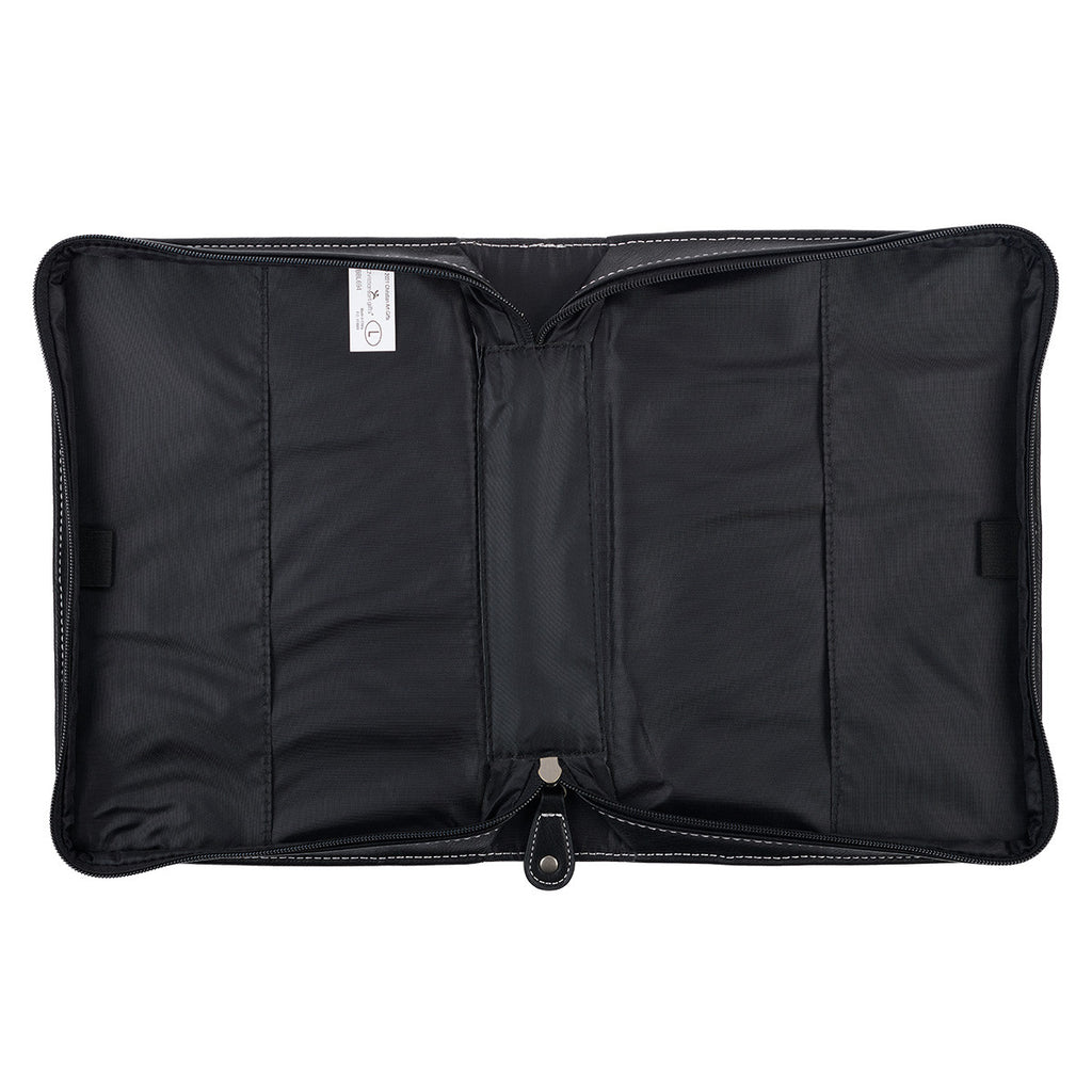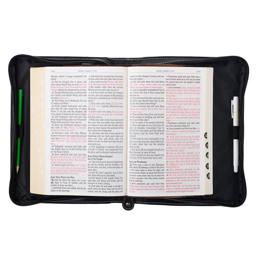 Silver metal hardware securely attaches the lay-flat handle to the spine, and a black faux leather zipper pull ensures the zipper closes smoothly. Topstitching along the edges of the design adds strength to a sturdy structure. A slip pocket on the back panel is useful for holding your church bulletin, notes, or verse cards, and two pen loops are included in the interior for keeping pens and highlighters within reach.