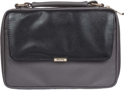 Bible cover with spine handle Flap over cover Smooth and textured; faux leather Laser engraved zipper pull and badge Black and grey Faith Fits Bibles