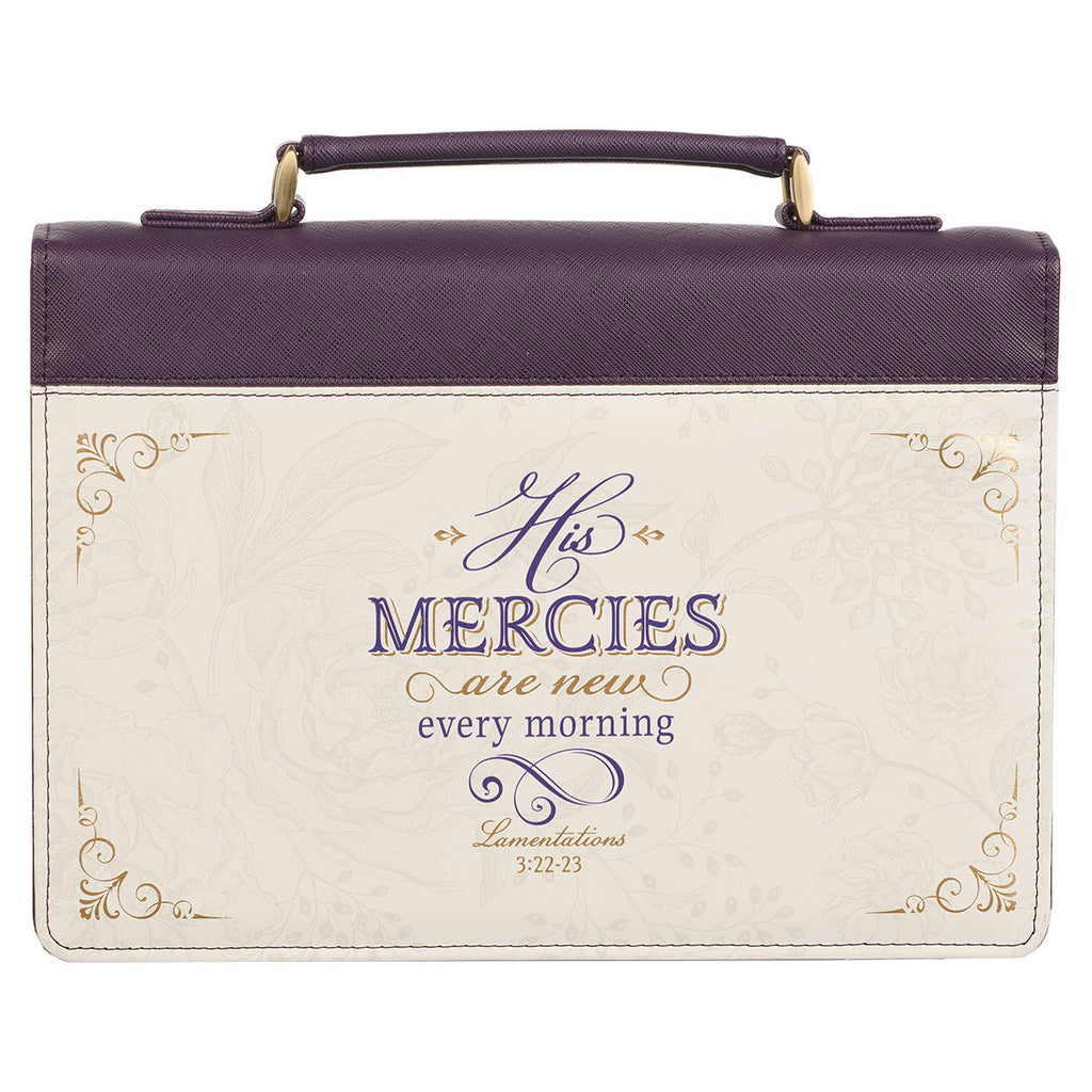 Rejoice in the never ending supply of God's mercy every time you open the His Mercies Are New Dark Amethyst Purple Fashion Bible Cover to read your Bible. Let the message of this gorgeous Bible case nourish your heart and soul while its sturdy faux leather construction protects your Bible from the wear and tear of loving use.