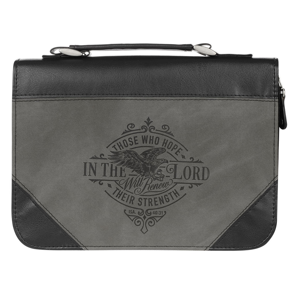 The black faux leather back cover of the Bible case wraps around the spine and meets a lightly textured gray front panel with a double row of black topstitching. Black corner accents reminiscent of a classic half-bound style, accent the front panel. The sentiment is presented in a stunning heat-debossed typographical design where intricate scroll lines and framing details encase the words and a strong, soaring eagle strikes at the center.