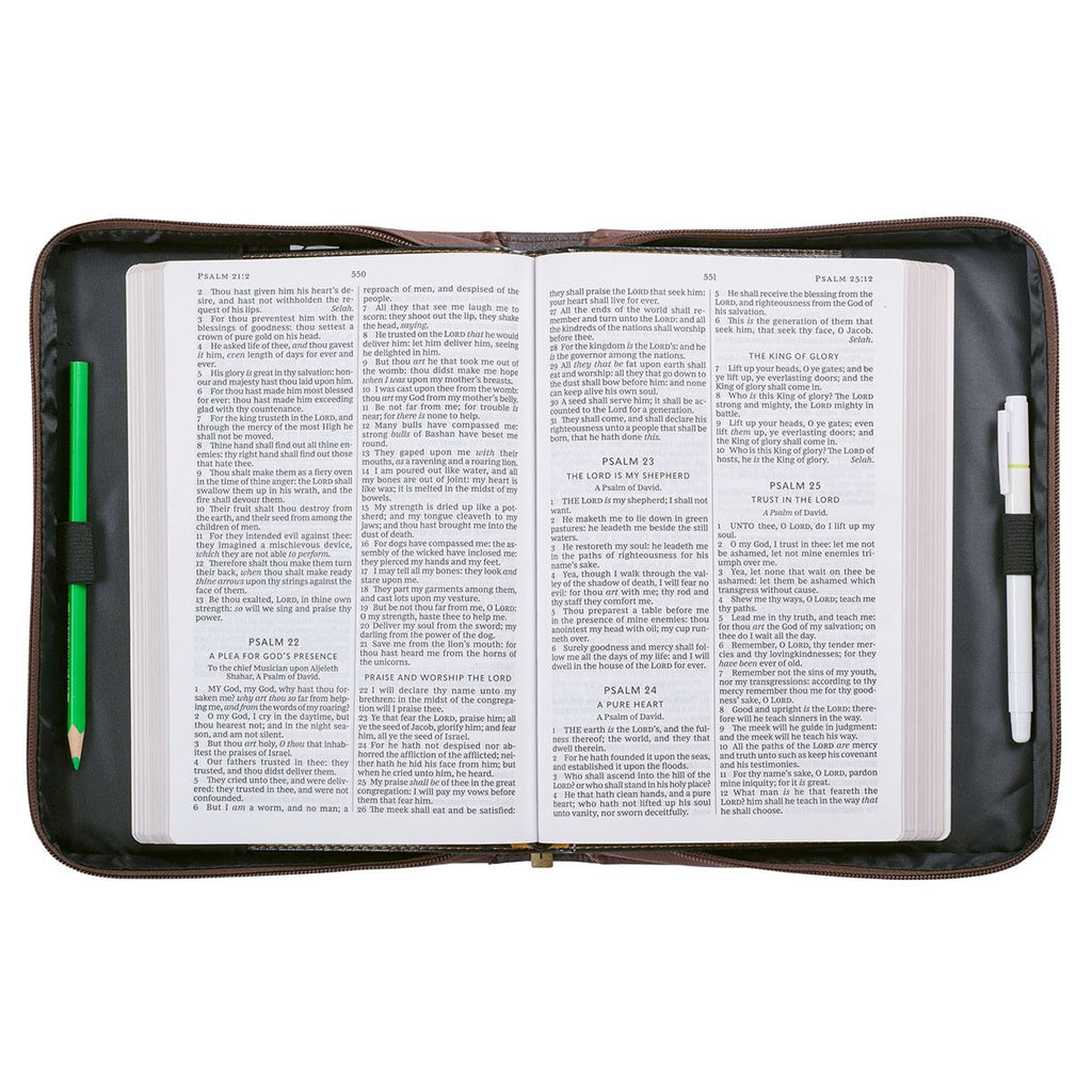 The faux leather Bible cover has an exterior slip pocket on the rear panel for keeping loose notes. A convenient lay-flat spine handle enables the Bible case to open completely. The antique gold zipper pull is engraved with a cross design and closes smoothly to keep your Bible secure and protect it from wear and tear. On the inside are 2 pen loops to hold a pen or a highlighter and 2 slip pockets to hold securely hold the covers of your Bible.