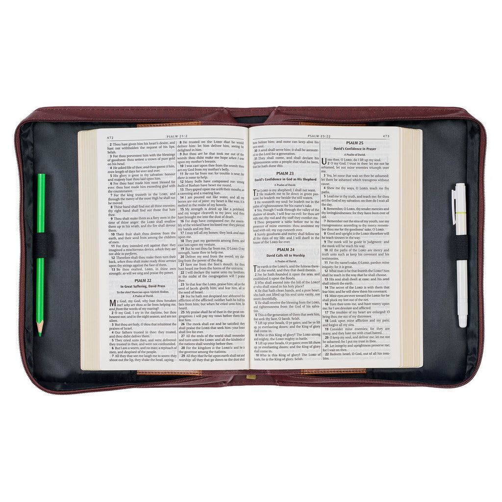 Protect your Bible with The LORD's Prayer Walnut and Burgundy Faux Leather Classic Bible Cover and get two features for the price of one: a sturdy protective cover and a beautiful reminder of the prayer Jesus taught his disciples to pray.