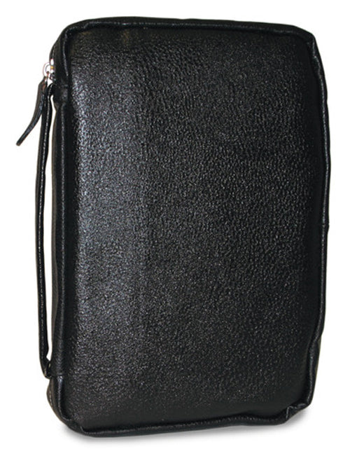 Genuine leather Bible cover in black features a stylish pebble grain texture with durable spine carrying handle and zipper closure. Fully lined inside with ribbon marker inscribed with verse from Joshua 1:8, four pen holders, and clear vinyl sleeve for I.D. or credit cards. Do not let this Book of the Law depart from your mouth; meditate on it day and night, so that you may be careful to do everything written in it. Then you will be prosperous and successful. Large fits Bibles up to 168 x 241 x 50 mm