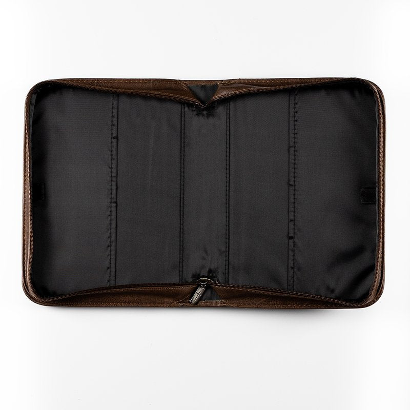 Topstitching around the rounded corners of the Bible cover adds stability and quality to the design. An exterior slip pocket on the back panel can be used to keep loose notes safe. A lay-flat spine handle with brushed silver hardware allows the Bible cover, and consequently the Bible, to open completely flat. A zipper with a brushed silver cross-engraved zipper pull opens and closes smoothly, and keeps loose papers secure. 2 interior pen loops are included for storing pens or highlighters.