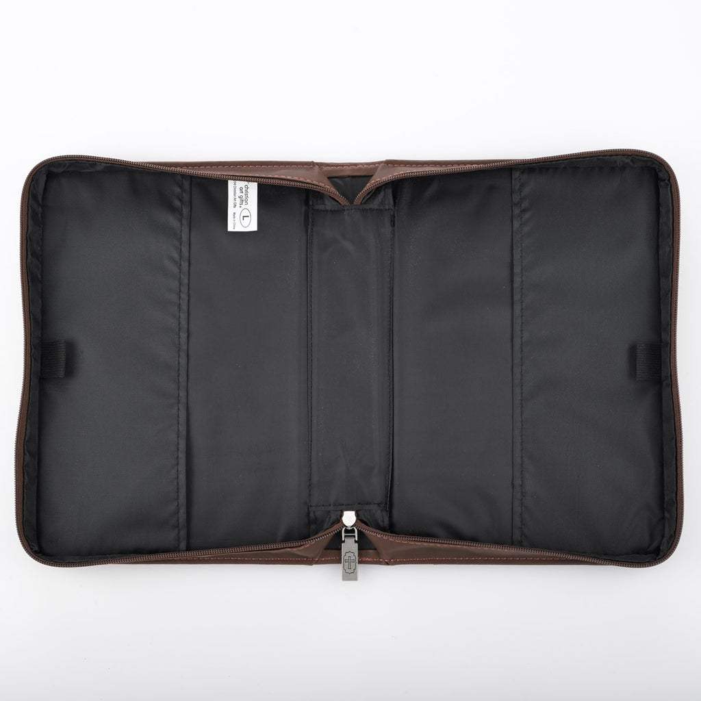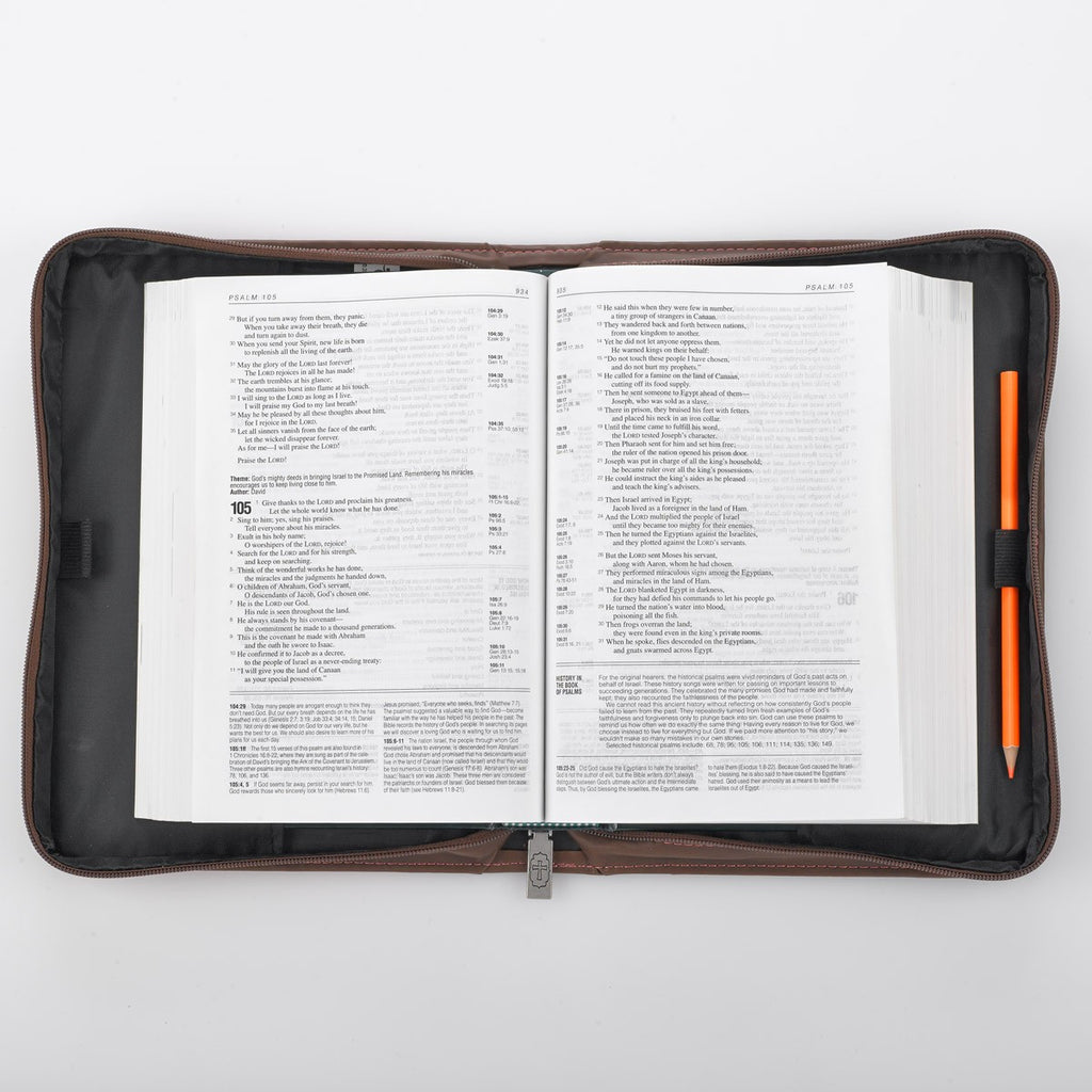The two-color book cover has an exterior zipper with a cross engraved zipper-pull, an exterior slip pocket on the back cover, a convenient lay-flat spine handle and 2 pen loops inside.