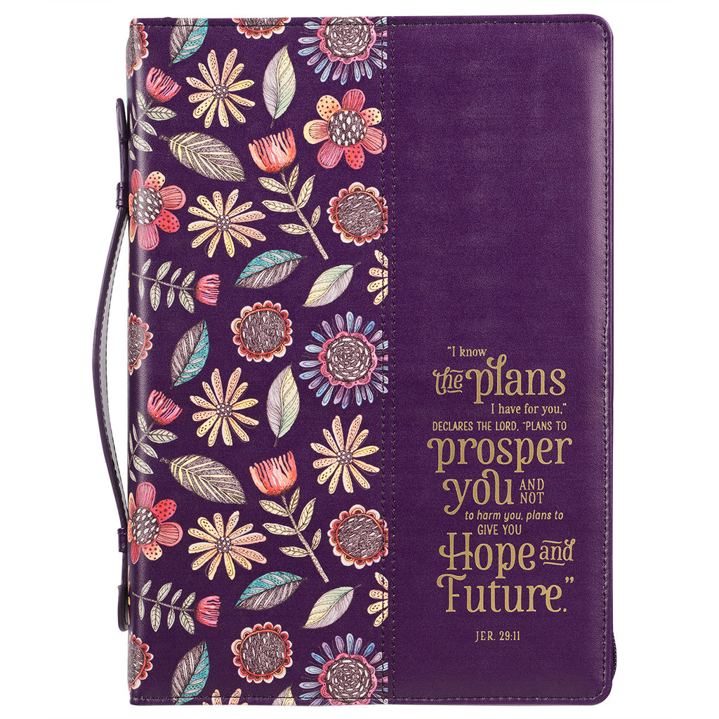 The I Know the Plans Purple Floral Faux Leather Fashion Bible Cover conveys the hopeful message that our well-being is ultimately in the hands of our Creator while also providing stylish protection for your Bible.