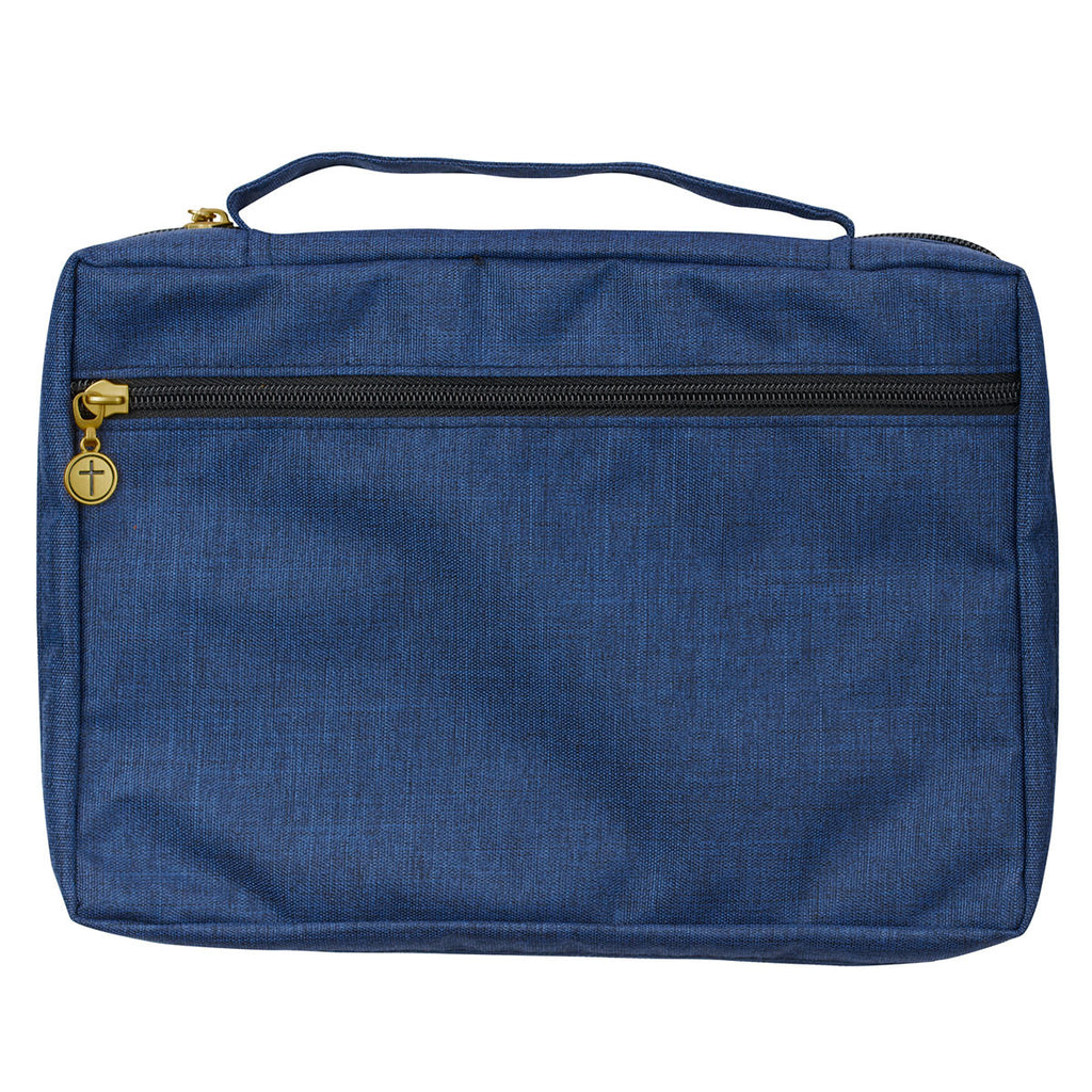 The Bible cover opens completely flat thanks to a lay-flat spine handle constructed from the same durable fabric. A black zipper with a cross-engraved brushed gold zipper pull closes tightly to keep valuables inside. An exterior zip pocket with a cross-engraved zipper pull is added to the back panel to store loose papers and even kleenex. Two pen loops and two slip pockets to hold the outer covers of the Bible can be found inside.