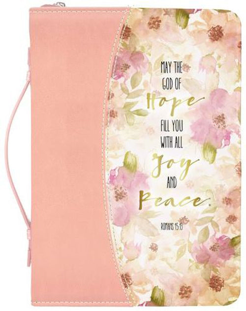 God of Hope Joy Peace Romans Bible Cover features flower design and sentiment reading May the God of hope fill you with all joy and peace. Romans 15:13Cover is made of polyurethane faux leather with floral peach finish Bible cover is size medium and measures approximately 9 x 6.15 x 1.75 inches, Embellished with applique and hot stamp features; Includes zippered closure and spine carrying handle