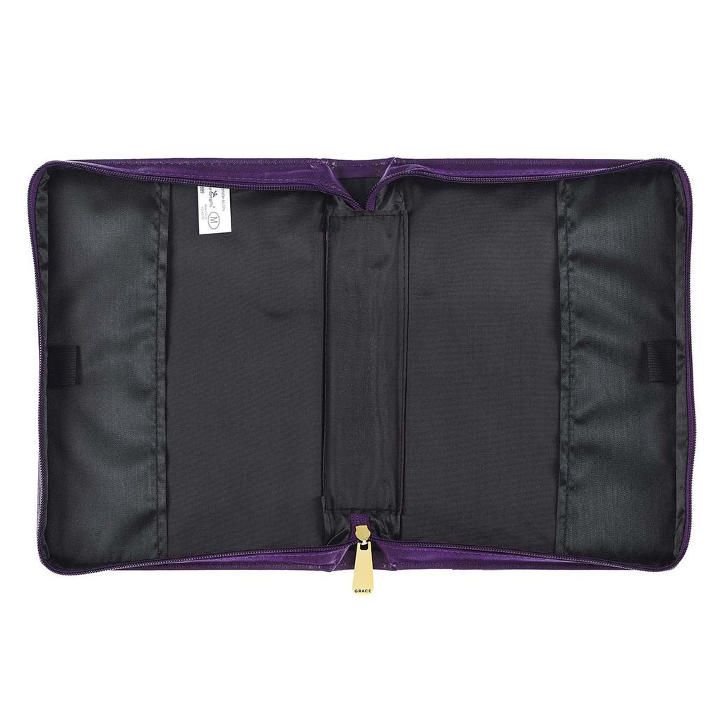 The stunning deep purple faux leather Bible case is heat-debossed with a floral design. Gold foiled lettering draws attention to the sentiment