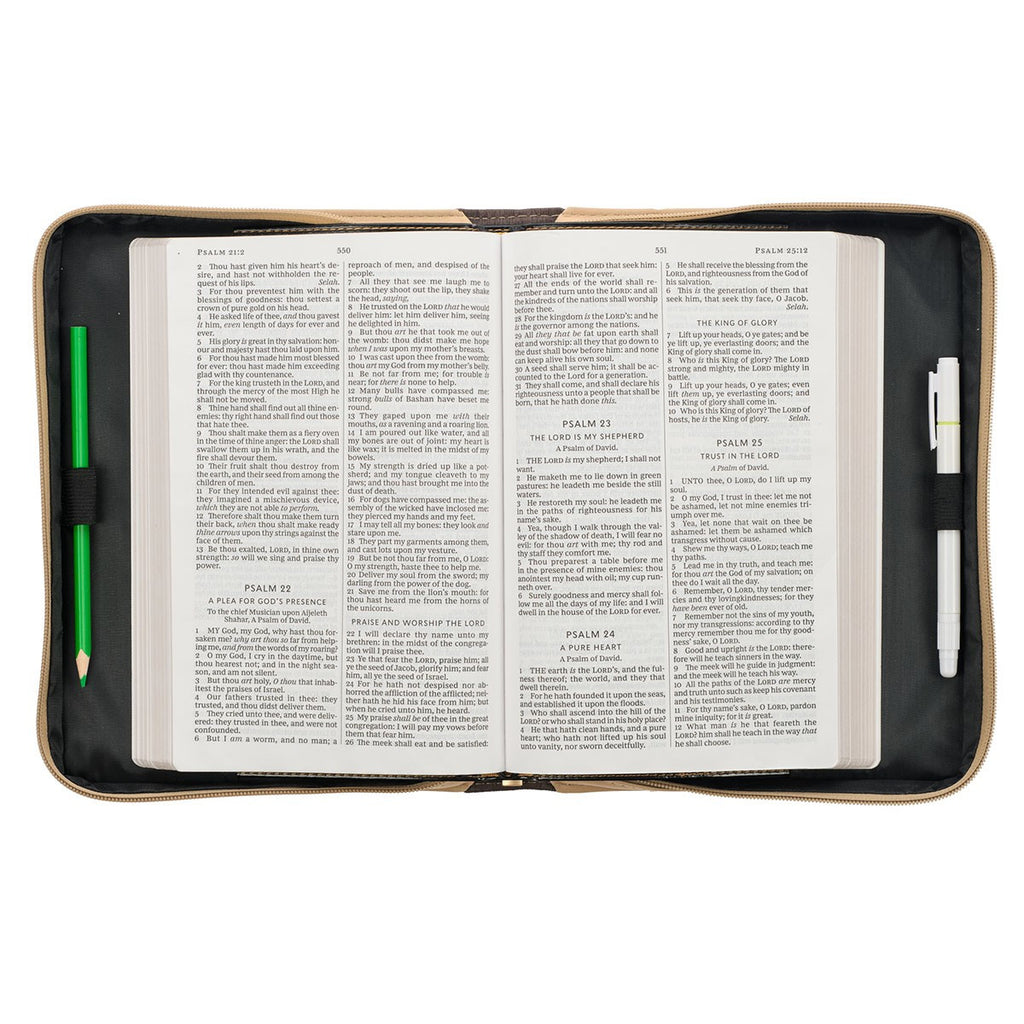 The zipper with a brushed gold cross-engraved zipper pull keeps loose notes secure and closes smoothly. An exterior slip pocket on the rear panel can hold items such as church bulletins or loose papers. A convenient lay-flat spine handle allows the Bible cover to open fully. For your convenience, 2 pen loops are included on the interior.