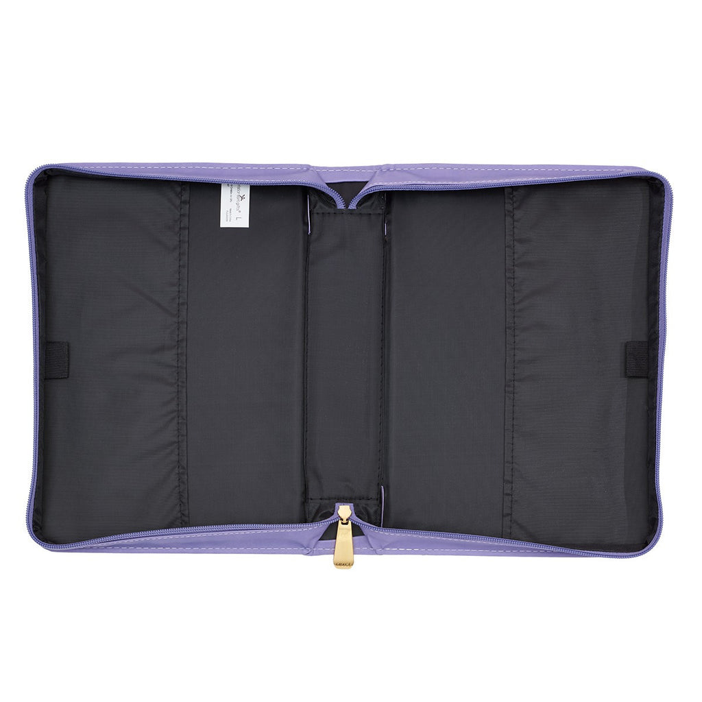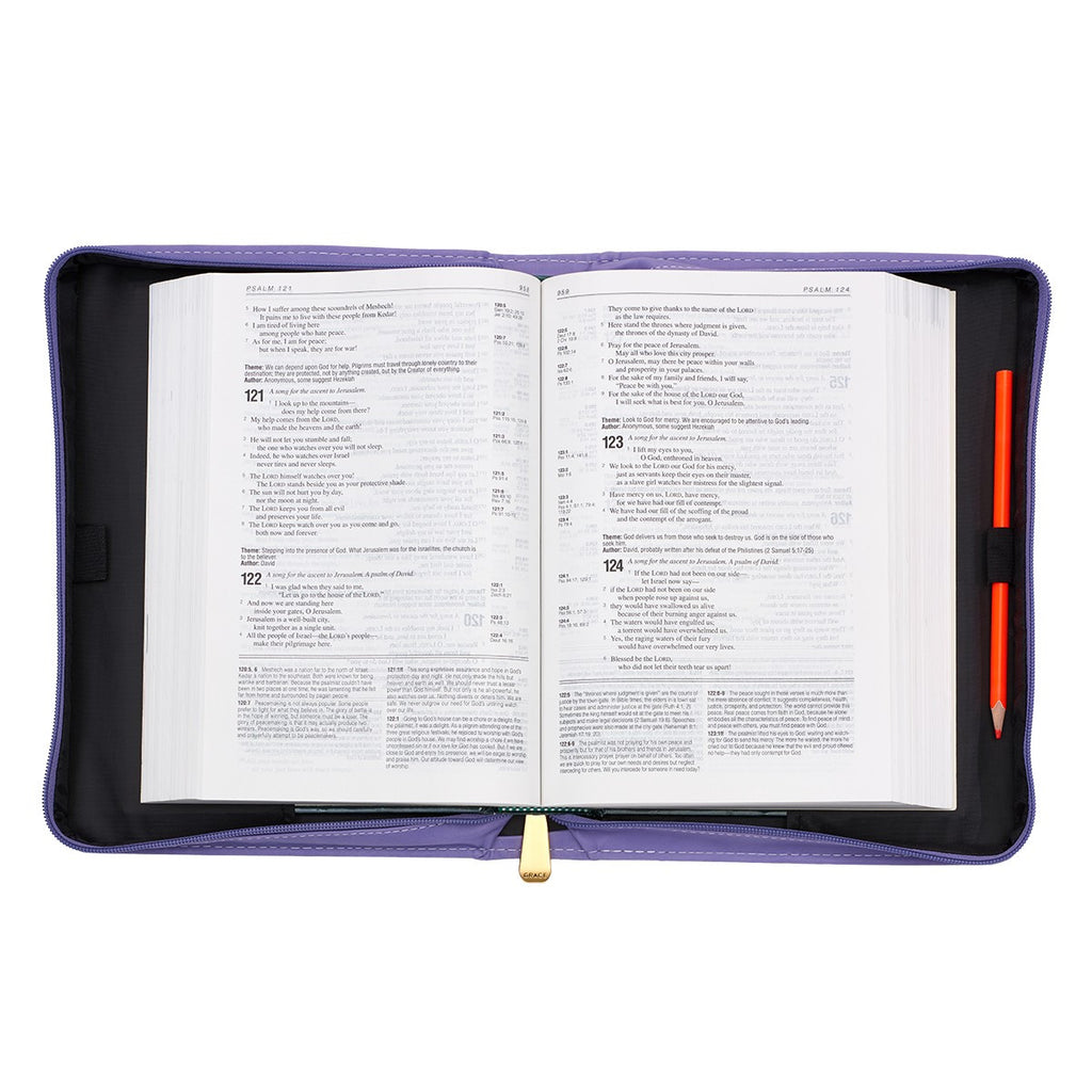 The back cover features a slip pocket that s decorated with a heat-debossed floral arrangement accented by gold foil. A lay-flat handle on the spine folds completely flat when you open the Bible and a heavy-duty gold zipper pull, engraved with the word "grace," securely closes the Bible case.