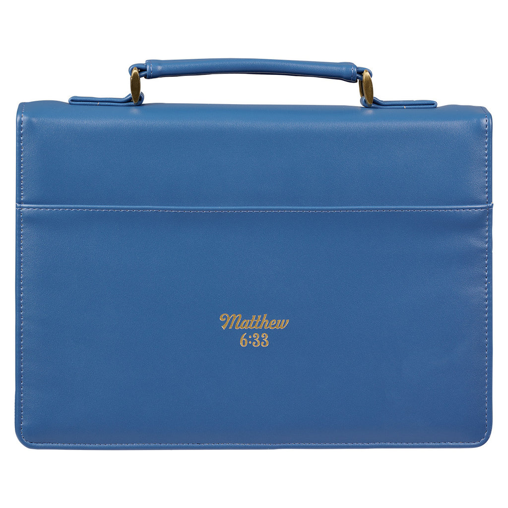 Blue topstitching runs along the edges of the cover to secure it. The Scripture reference to the sentiment is repeated in gold-foiled letters on the back slip pocket, which is a helpful addition to store church bulletins or loose notes.