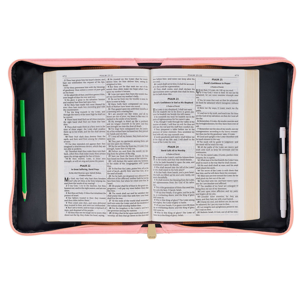 A zipper closure with a gold zipper pull allows you to close the Bible cover and protect it from damage. Matching gold handle hardware secures the lay-flat handle to the spine. Two pen-loops inside the cover are ideal for storing pens, pencils, or highlighters for dedicated Bible study and notation.