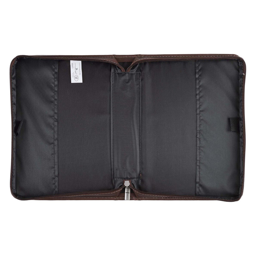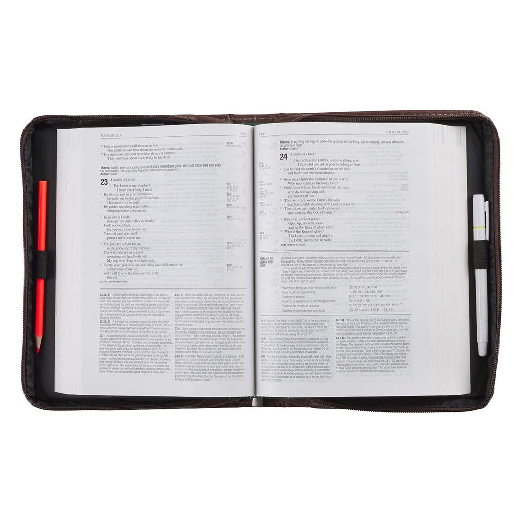 Inside the Bible case you will find two pen loops to secure your pen or highlighter when not in use. The silver cross engraved zipper-pull adds a final detail to finish off the design.