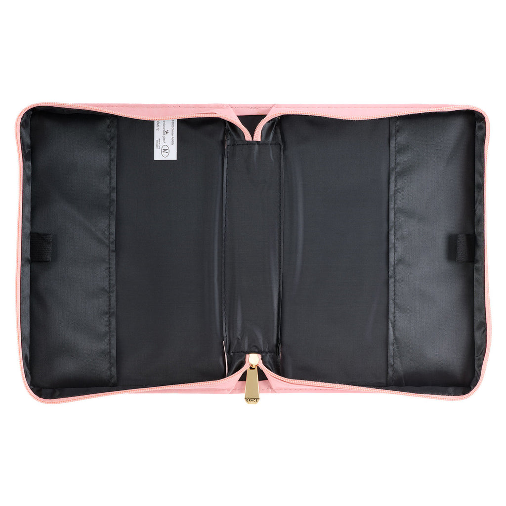 Other exterior design features include a pink slip pocket on the back panel, gold handle hardware, a lay-flat carry handle, and a gold cross-engraved zipper pull. Inside the Bible case are two pen loops that allow you to store pencils, pens, or highlighters.