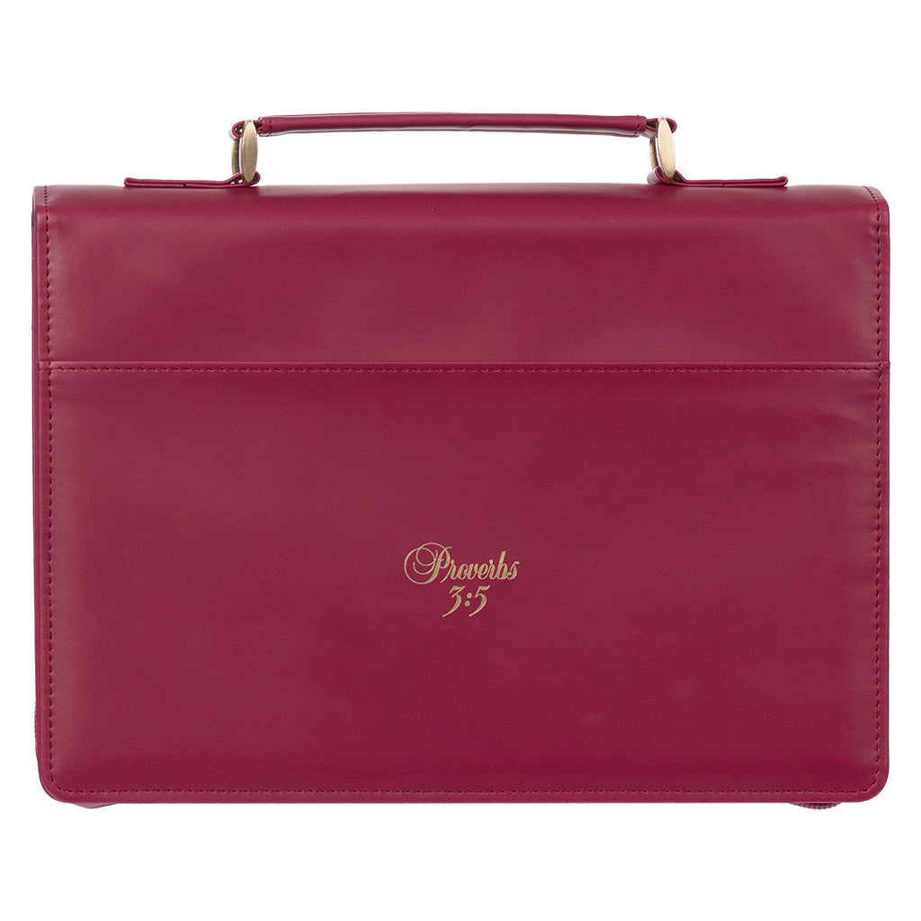 The Trust in the LORD Floral Pomegranate Red Faux Leather Fashion Bible Cover will be your daily reminder to release your fears into the hands of an all-powerful God who loves you and is for you. Reflect on this truth as you unzip the protective Bile case in preparation for Bible study.
