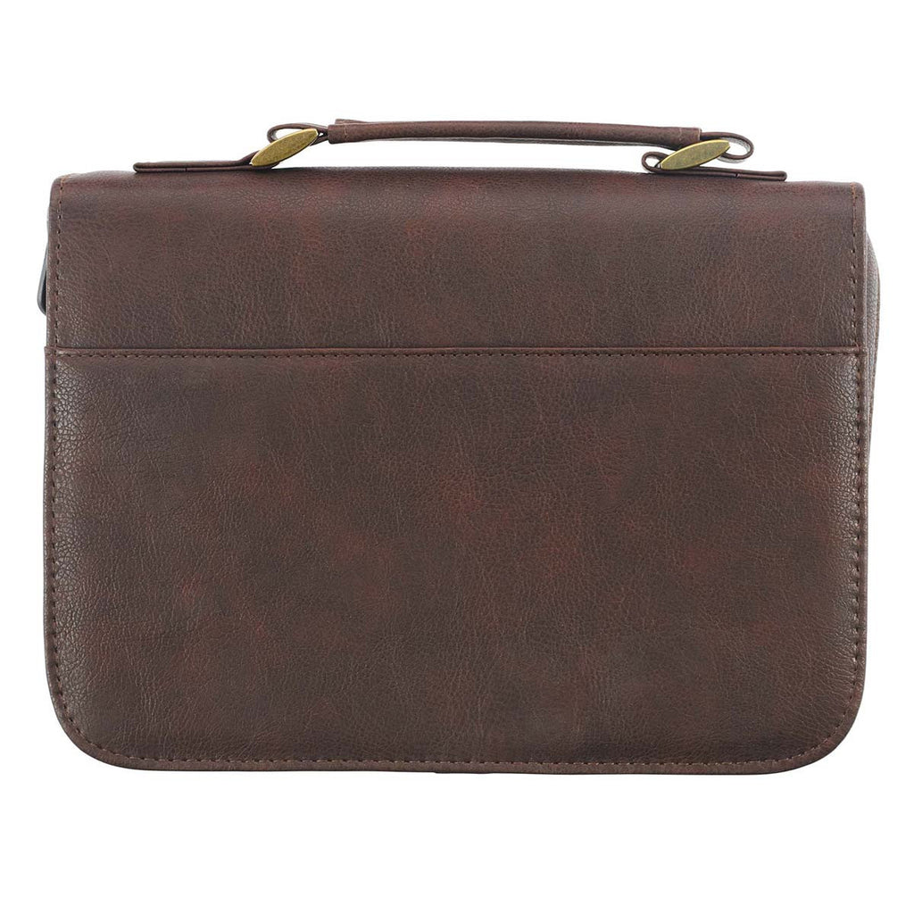 An easy-to-carry faux leather handle is attached with brushed gold metal hardware and folds completely flat when the cover is opened. This Bible case also comes with an exterior slip pocket and two interior pen loops, so you can keep all your materials safe in one place. Brown topstitching borders the edges and panels, lending durability to the design. The brown faux leather zipper pull glides closed smoothly to keep the Bible within entirely secure.