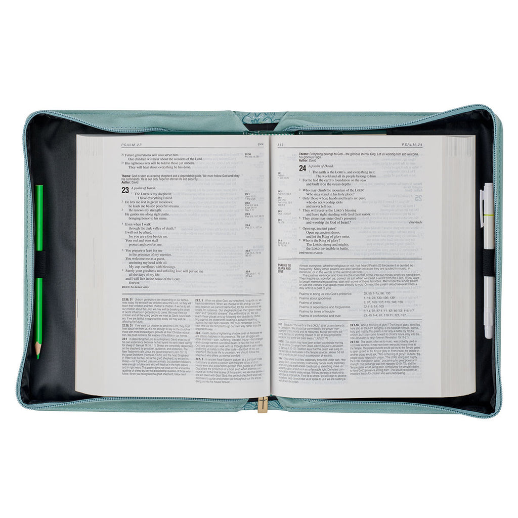 This cover's scuff-resistant faux leather construction keeps your Bible safe whether you use it home or take it to church. A teal lay-flat handle runs along the spine, with gold metal hardware securing it to the cover for an easy grip. A cross-engraved gold zipper pull keeps the cover securely closed, so you can keep sermon notes and prayer cards tucked safely inside. You can also keep your writing supplies at the ready with the two interior pen loops. An exterior slip pocket is included to hold loose notes and church bulletins.