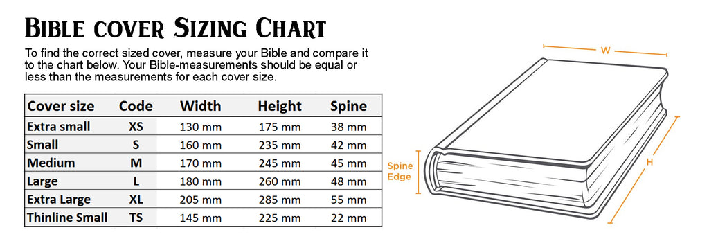 This Bible cover is available in two sizes: medium and large. Please refer to the last image in the image carousel on the left for the Bible Cover Sizing Chart before ordering.