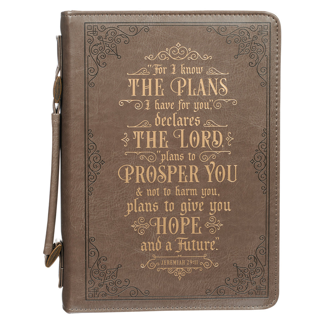 Cover your Bible in this For I know the Plans Brown Faux Leather Classic Bible Cover for a convenient and fashionable way to protect your prized possession! The sentiment on the Bible cover will remind you that God has good plans for your life.