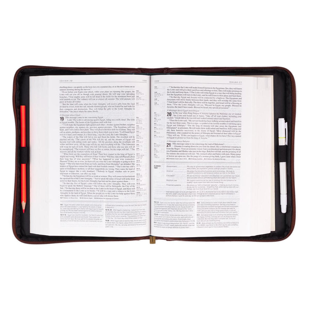 This brown luxleather Bible cover has an exterior slip pocket to store study material and notes. Inside you will find a pen loop to secure your pen or highlighter when not in use. The cross engraved zipper pull adds an additional touch to finish off the design.