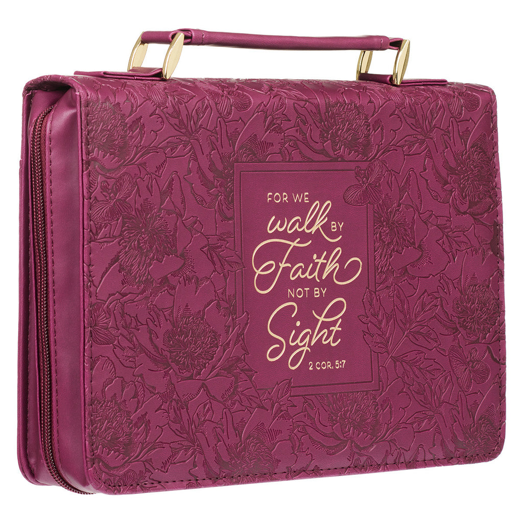 The Walk by Faith Ruby Red Faux Leather Fashion Bible Cover is your cue to take on life with the confidence that comes from knowing you serve an Almighty God, and this sturdy Bible case will remind you of this honor every time you unzip it to read from God's Word.