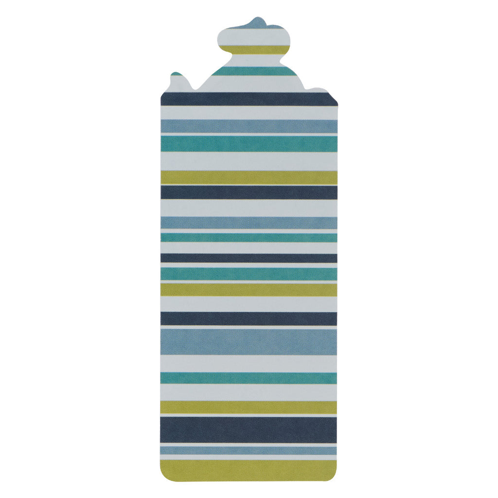 The back of the bookmark is decorated in irregular horizontal black, gray, forest green, and olive green stripes. The bookmark is individually packaged in a PVC pouch with a hanging tab.