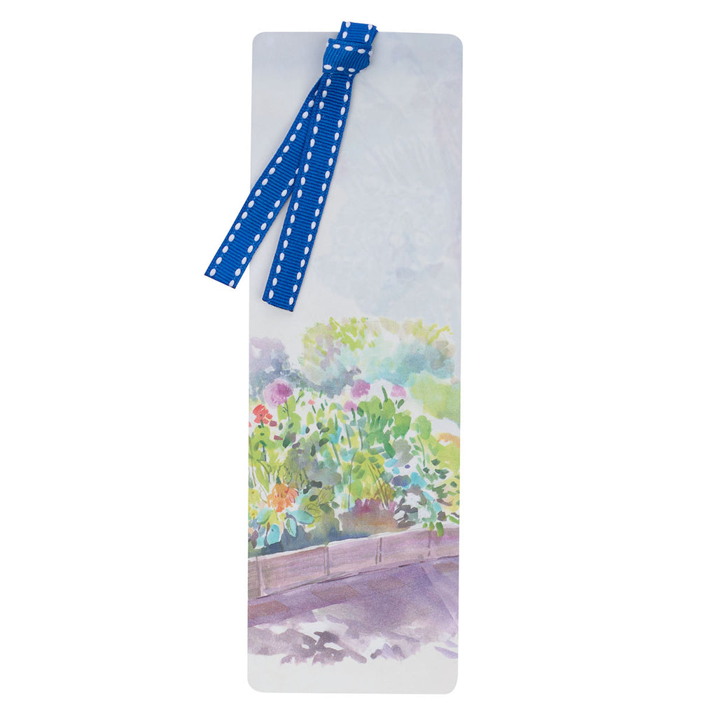 The garden scene continues on the back of the bookmark and is complemented by a blue ribbon with white stitching tied at the top of the bookmark. Each bookmark is packaged in a PVC sleeve with a hanging tab.