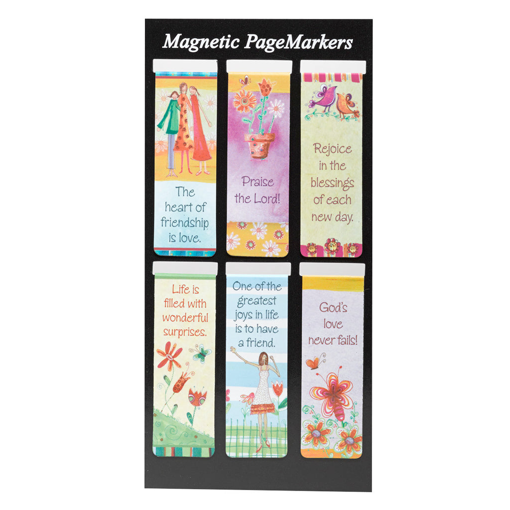 The Whimsical Scripture Christian Magnetic PageMarkers come in a set of 6 whimsical and bright pagemarkers in each pack. The Scripture-based pagemarkers have verses on the back, including Psalm 145:9, 1 Samuel 2:1, John 15:12, Hosea 14:4, Proverbs 17:17 and 2 Corinthians 9:8.