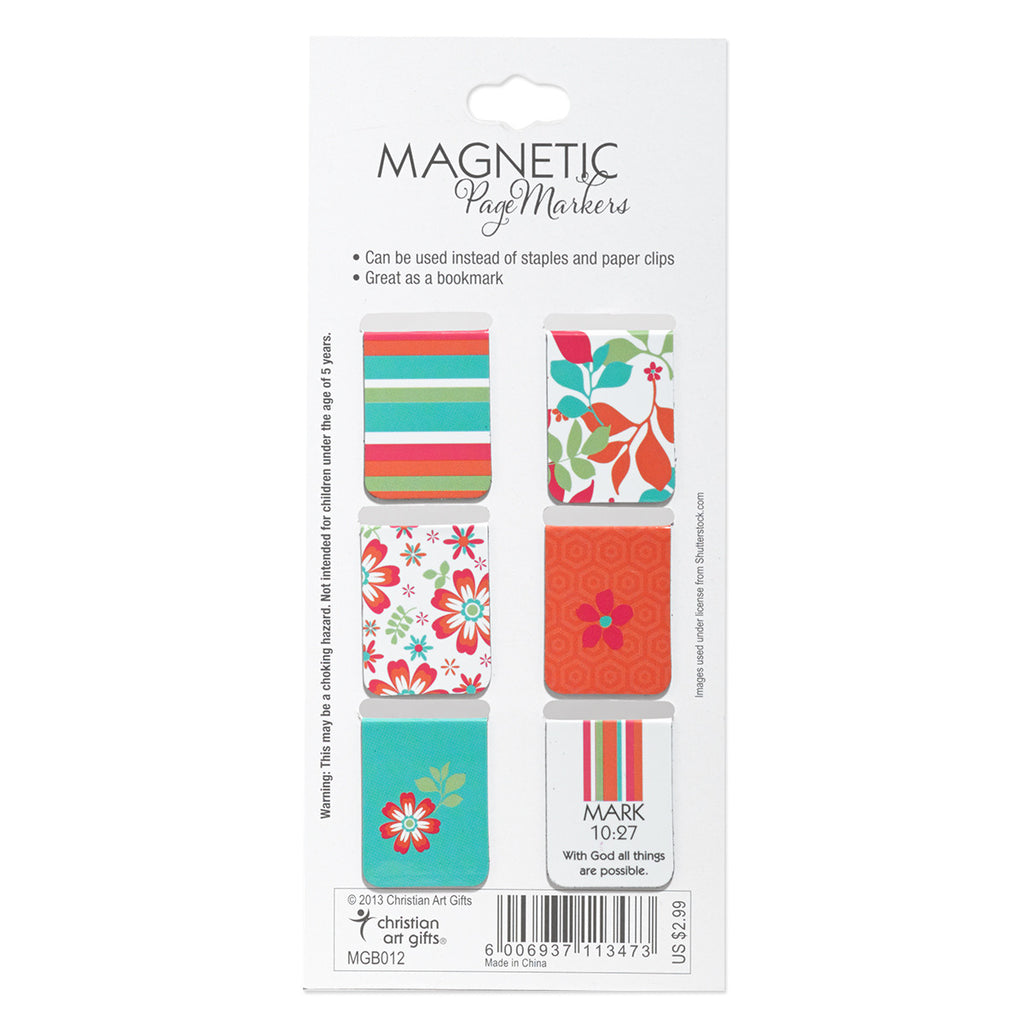 The With God All Things Are Possible Mini Magnetic Bookmark Set includes six mini magnetic bookmarks - each with a vibrant design on both the front and back. Printed at the bottom of the backing board is a verse from the Book of Mark.
