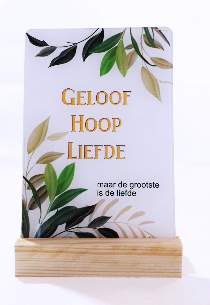 Acryl standaard met houten houder. Door het glanzende kunstof komen de diepe kleuren mooi en helder uit.