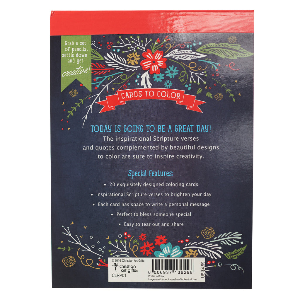 The Today Is Going To Be A Great Day Coloring Postcards can be used for anti-stress therapy and biblical inspiration. This collection of coloring cards is compiled of inspirational Scripture verses and quotes complemented by beautiful designs to color and bring your creativity to life.